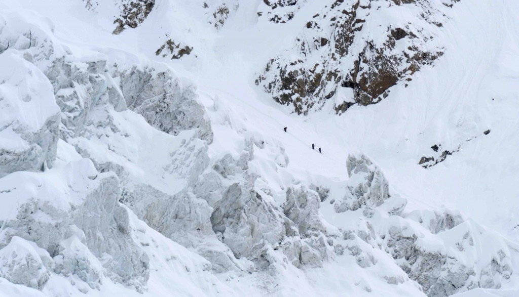Los primeros metros de escalada del día (300 metros de desnivel), por encima del Muro Kinshoffer, transcurrían a través de un terreno mixto que combinaba nieve, roca y hielo. Dos horas después de abandonar el C2 conseguían superar este primer tramo, atravesando primero dos campas de nieve, escalando después un espolón de roca y avanzando luego por una pequeña arista de nieve. Han parado al resguardo de una gran roca para comer algo y beber antes de meterse de lleno en la pala de hielo vivo (450 metros) que, sin duda, ha protagonizado la etapa de hoy por su espectacularidad: “Puede que en verano, nevada, esta pala resulte más liviana; pero ahora, completamente pelada, tiene unos 50-55º de inclinación, 60-65º nada más empezar”. De todas formas, dado que a diferencia de la última rotación, esta vez contaban ya con su cuerda fija, han ascendido a buen ritmo, y en dos horas alcanzaban el C3 (6.700m).