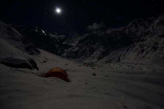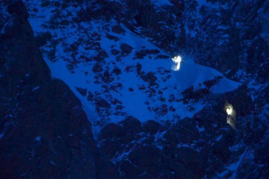Sin embargo, el día no ha resultado tan satisfactorio para los iraníes Mahmood y Reza, quienes optaron por pasar una noche más en el CB y partir hoy direnctamente hacia el Campo II. Parece que su apuesta no fue acertada, el tiempo se les ha echado encima y la noche ha llegado cuando aún se encontraban a mitad de pared y a los pies del muro respectivamente. De modo que han decidido retroceder y bajar hasta el CB para descansar aquí.